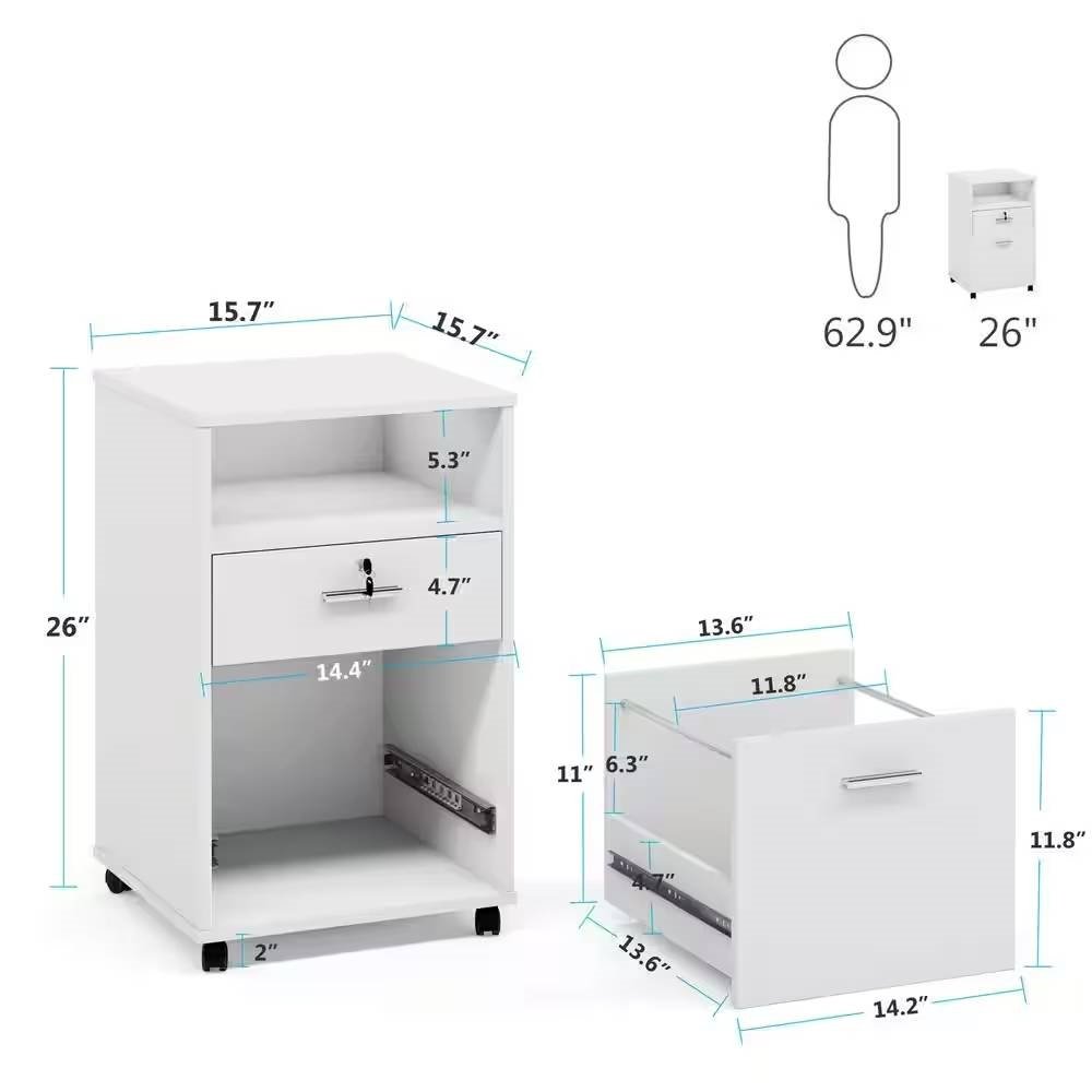 This White Rolling 2-Drawer Mobile File Cabinet Printer Stand Office Cart on Wheels has open storage spaces, file drawer, and storage cabinet is designed to keep the office machines, paper, files, and suppliers organized. It can be fixed beside or under the desk. The sleek and modern finish is an easy fit for any office or home study room. The bottom drawer is designed for hanging LETTER SIZE file folders, while the central drawer provides large storage for office essentials. The single lock system secures the center drawer, keeps your business private, and extends fully for easy access. 16” L x 16” W surface makes this printer cabinet hold your printer, files, documents, and decorations easily. The open shelf provides plenty of storage space for home office supplies. Rolling on four wheels, this printer stand can be moved and adjusted in the position freely. Built-In brakes on each caster are designed for added stability. This solidly constructed office cabinet could hold printers, scanners, fax machines, and any other office machines with an evenly distributed maximum weight capacity of 110 lbs. Tools and hardware are included.