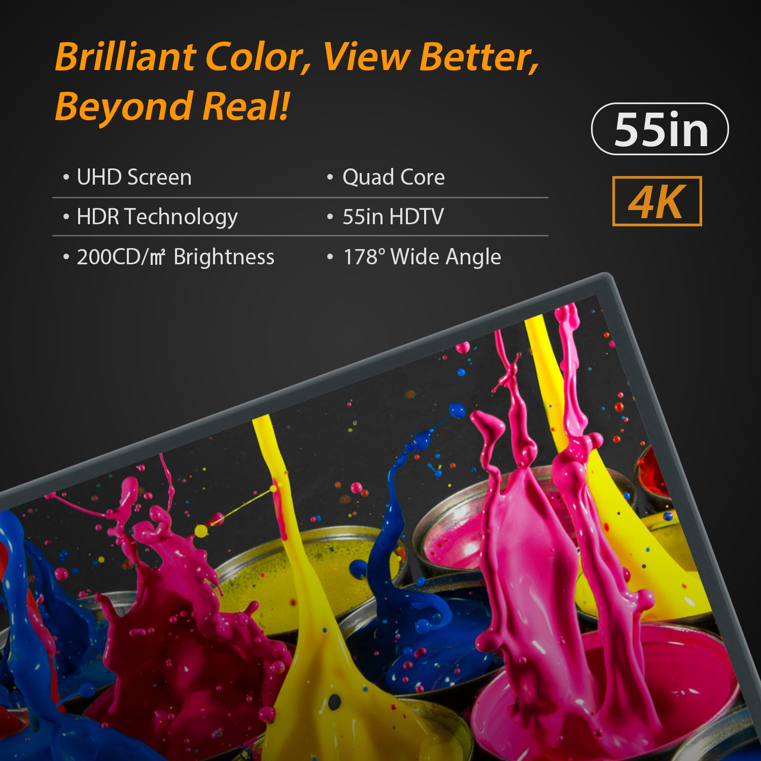 55 In 4K UHD HDR Smart LED TV 3840×2160 3 HD IN & HD OUT Ports 2 USB Ports